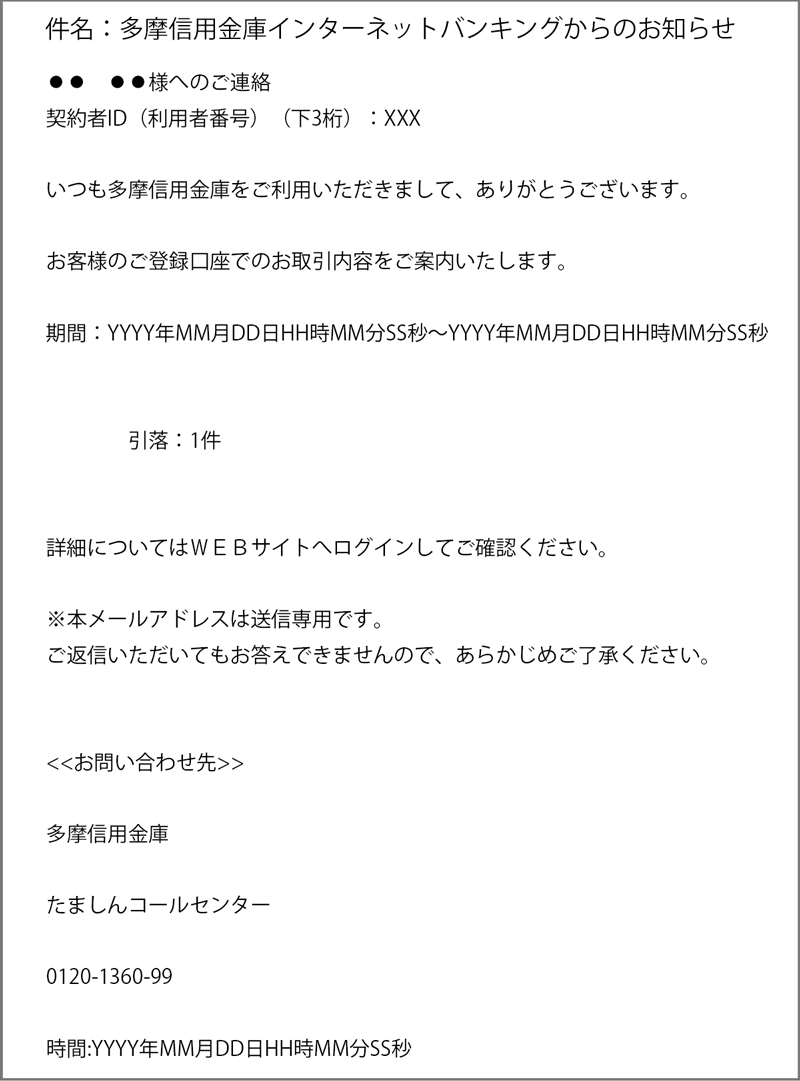 - インターネットバンキングの取引確認メールはイメージ図のようなメール文になっており、URLは一切記載されておりません。